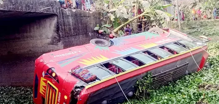 At least 20 passengers were injured, five of them critically, after a Dhaka-bound bus lost control and plunged into a canal in the Nagda area of Matlab South on Monday afternoon. The accident occurred on the Matlab-Gauripur road when the driver of ‘Jainpur Paribahan’ reportedly attempted to dodge an auto-rickshaw.